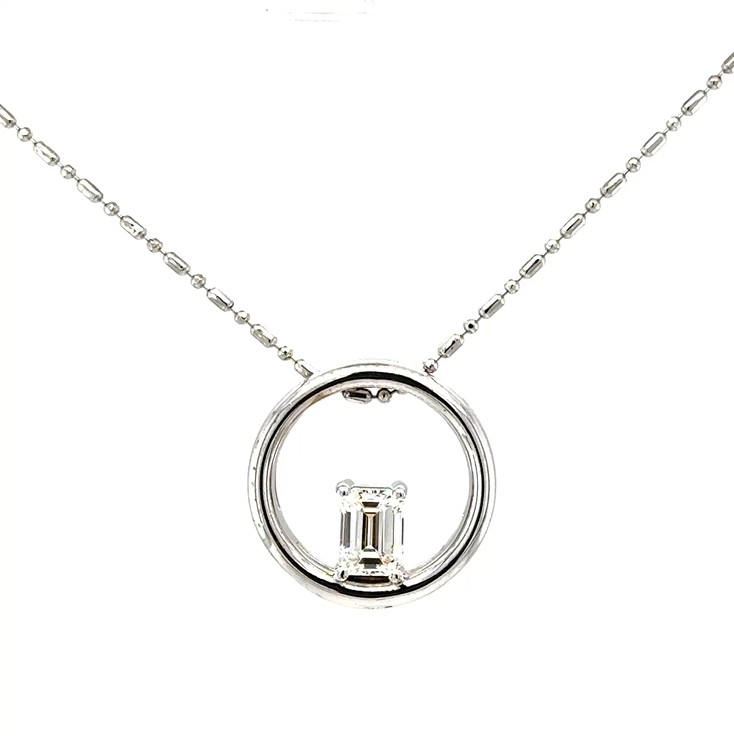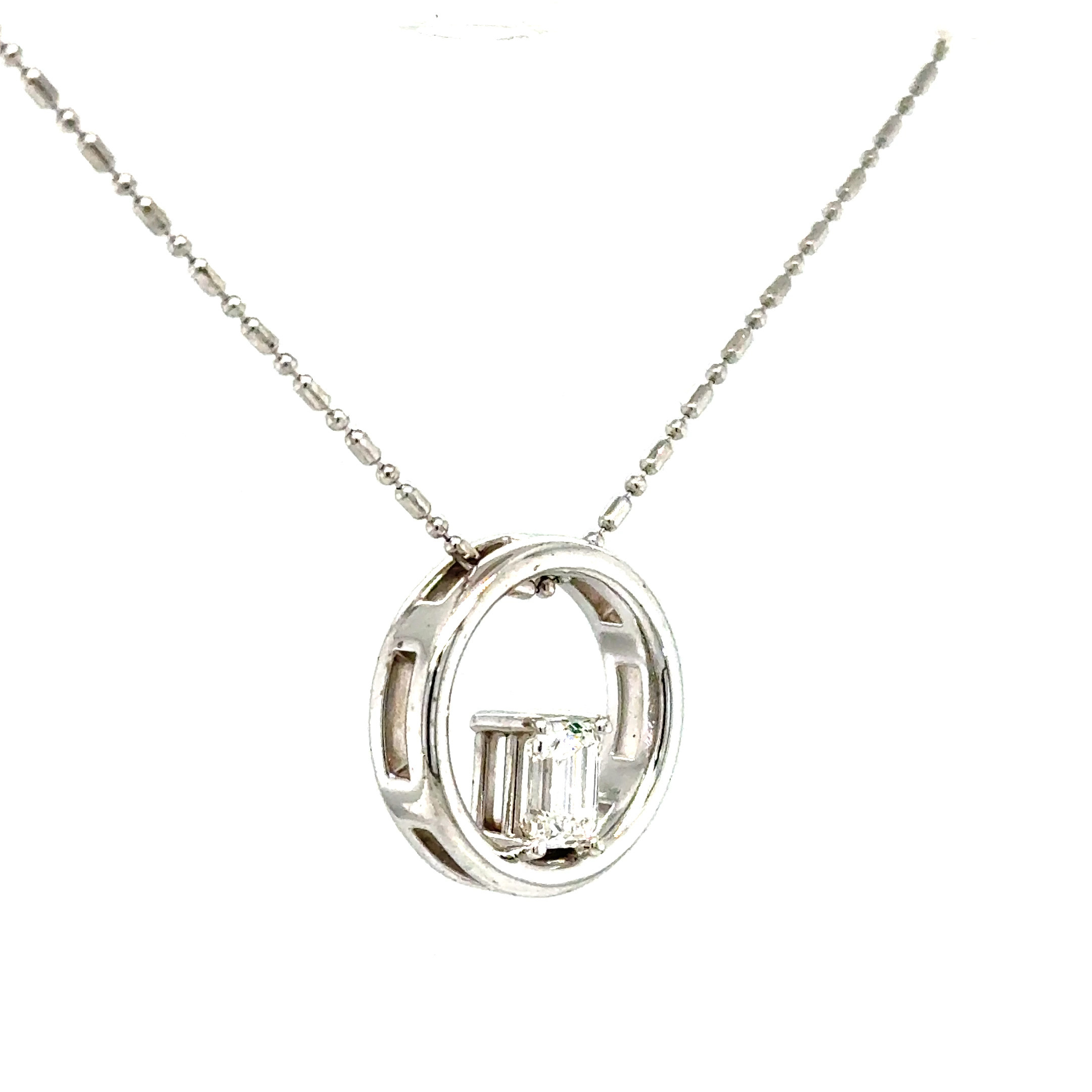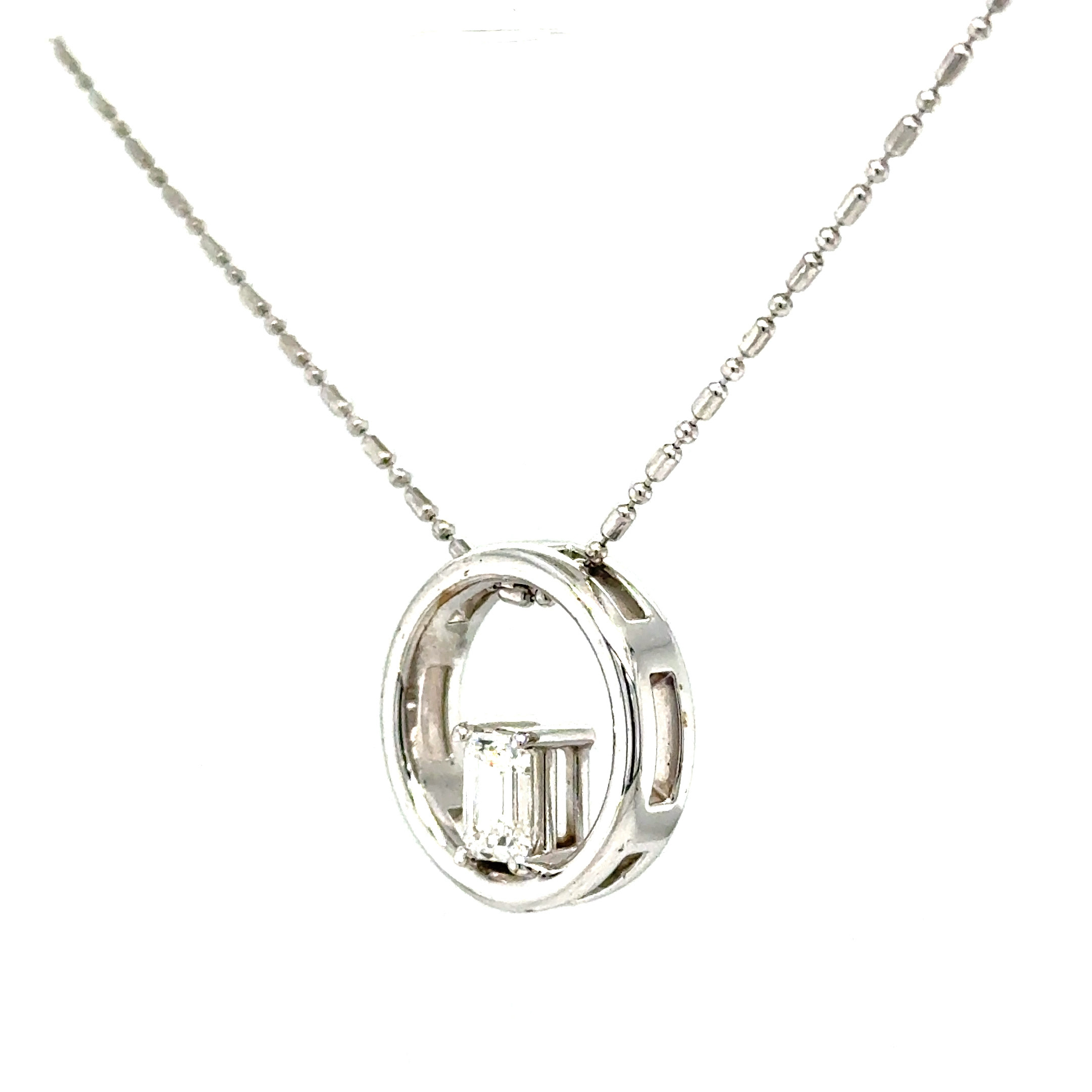 This striking 14K white gold pendant showcases a .56 carat emerald-cut diamond, graded G color and VS1 clarity. The clean, step-cut facets create elegant flashes of light and mirror-like depth, offering a refined brilliance distinct from traditional round cuts.