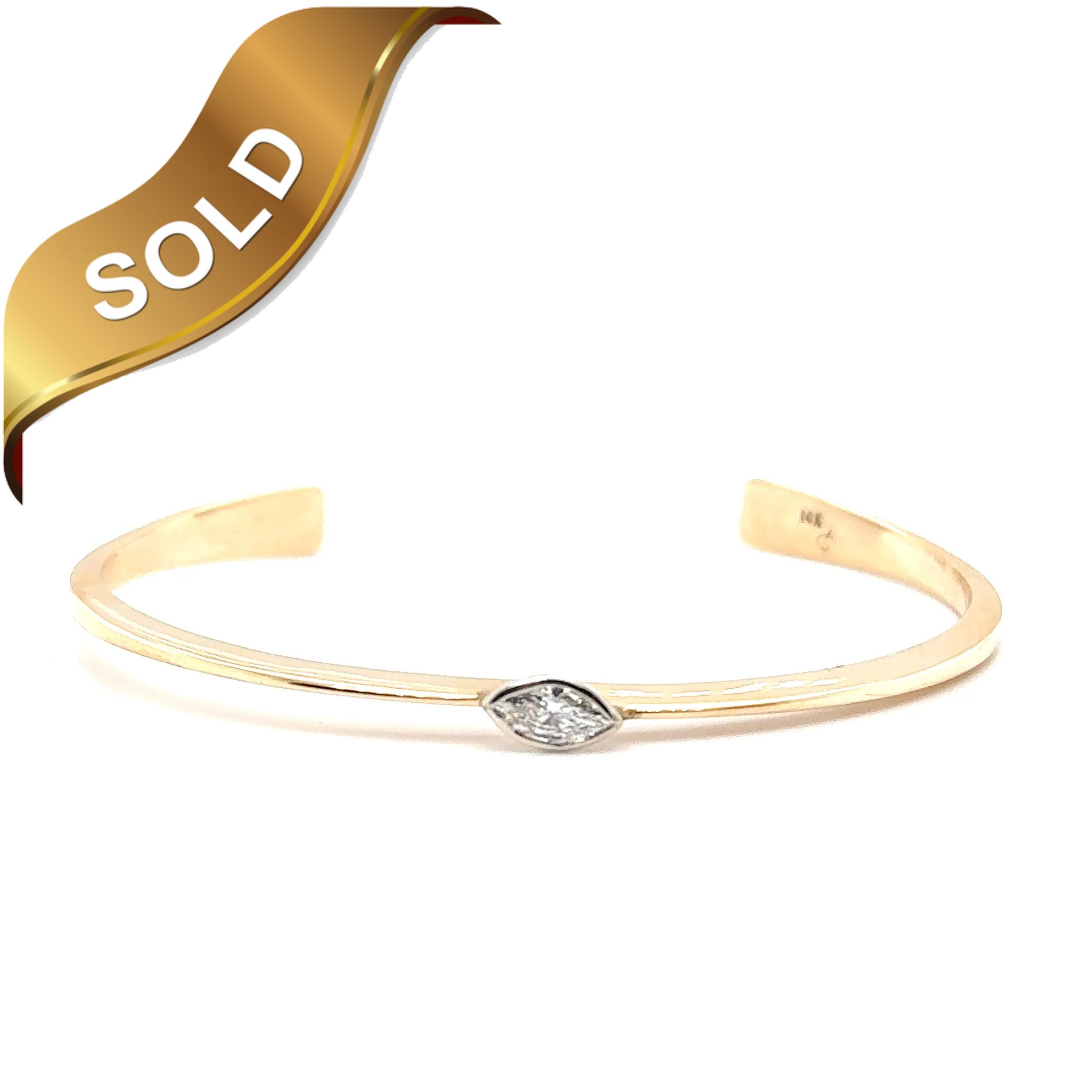 This refined 14K yellow gold cuff features a single marquise-cut diamond at its center, weighing .40 carats. The elongated shape creates a graceful focal point, drawing the eye with its elegant silhouette and vintage undertone.