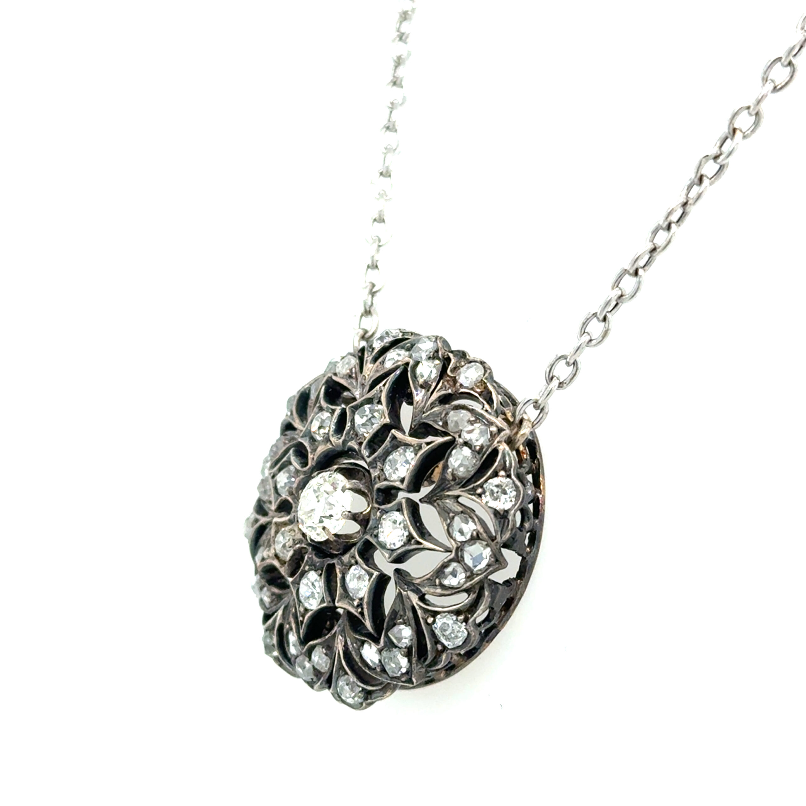 Sterling Silver/Gold Antique Stationary Diamond Necklace. The necklace is a round domed openwork motif with diamonds set in silver on a gold base.