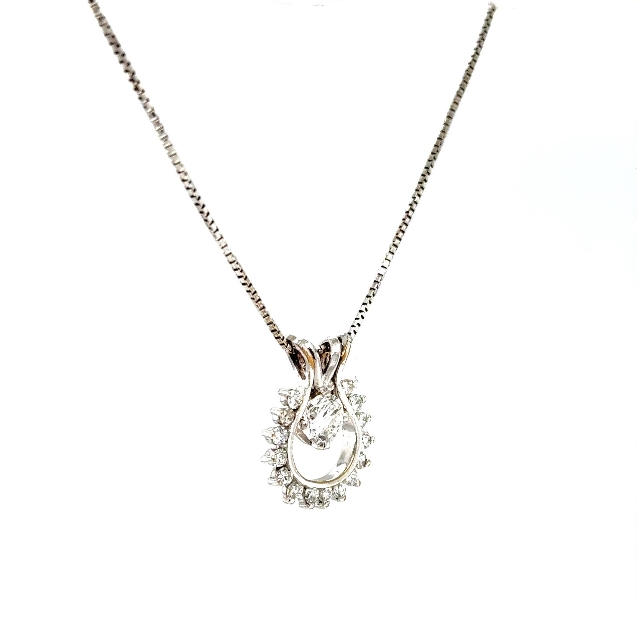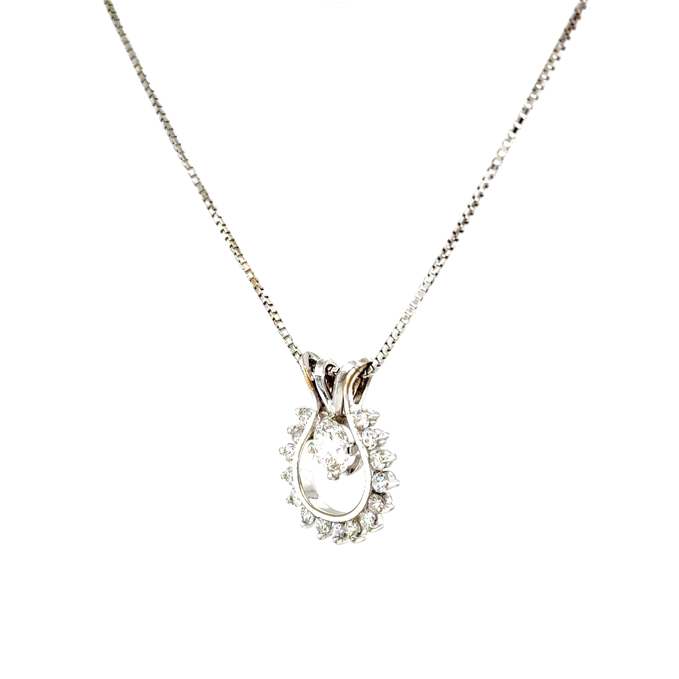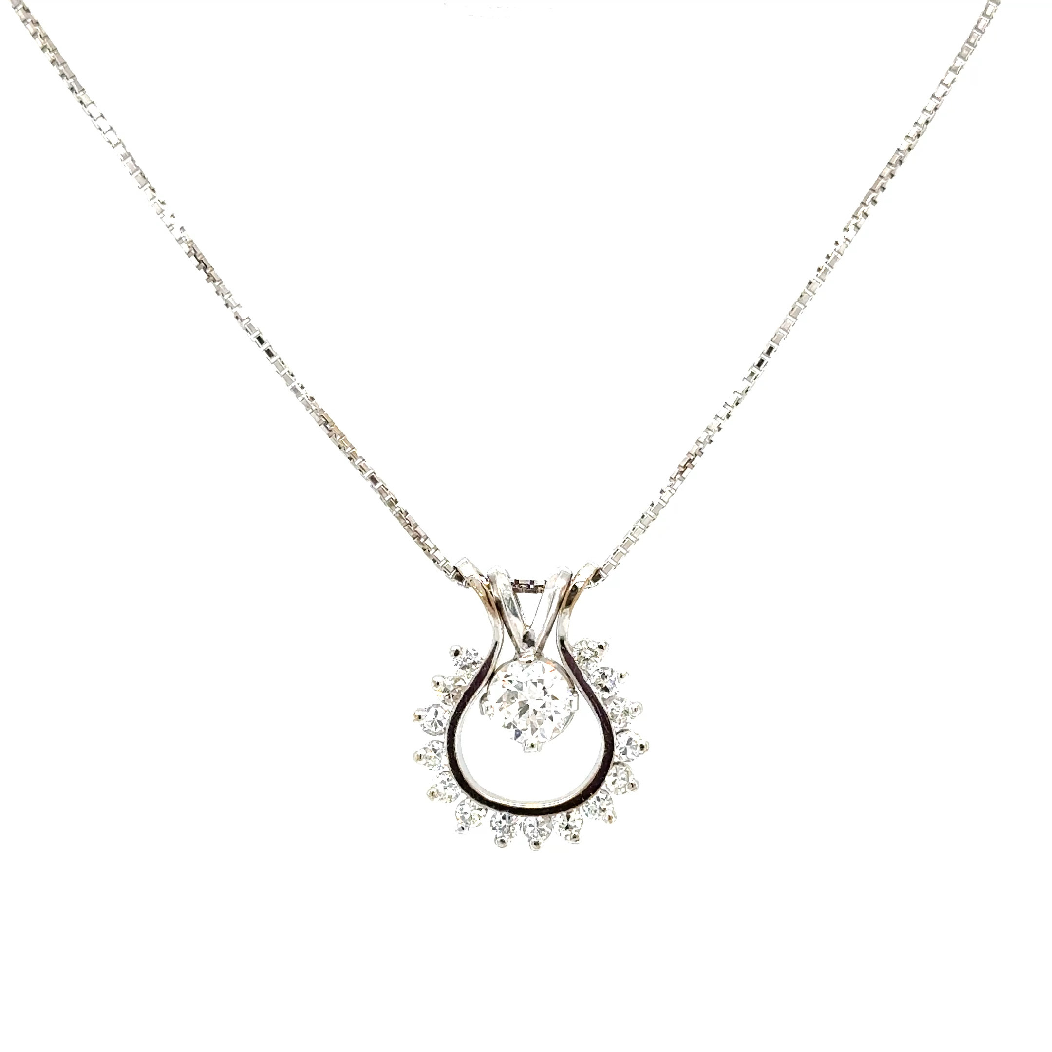 This elegant 14K white gold pendant features a .55 carat round brilliant cut diamond graded E–F color and VVS2 clarity. The center stone radiates exceptional brightness and precision, offering crisp sparkle with remarkable purity.